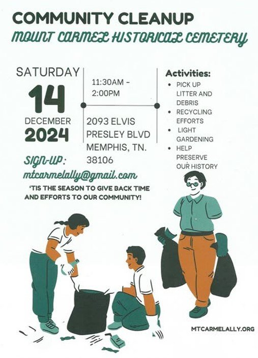 We're supporting a litter and landscape cleanup in partnership with Mt. Carmel Ally and Clean Memphis. Volunteers are needed to assist with restoring this important historic location! All supplies will be provided. Please dress in weather-appropriate clothing and wear closed-toe shoes.