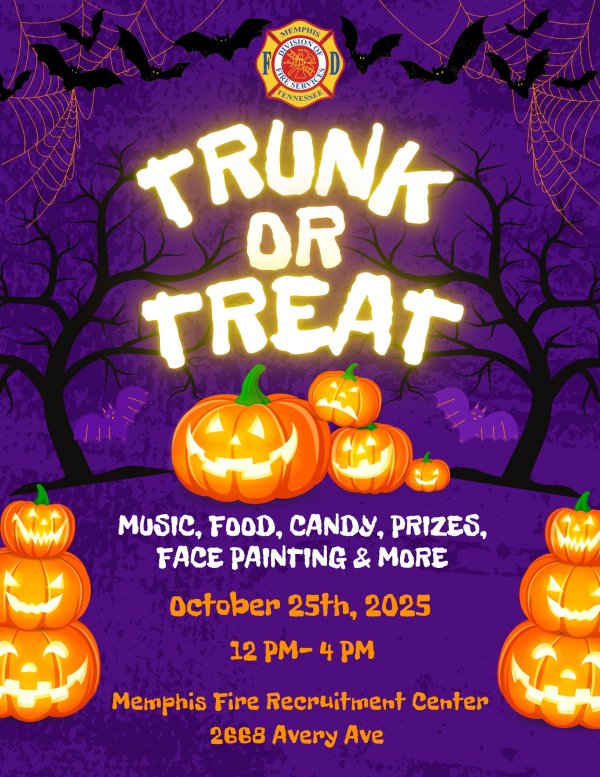 Get ready for a fun-filled afternoon with music, food, candy, prizes, face painting, and more! Bring your family and friends for a safe and exciting Halloween celebration hosted by your Memphis Fire Department. Saturday, October 25th, 2025 12 PM – 4 PM Memphis Fire Recruitment Center (2668 Avery Ave) Come in costume, enjoy the festivities, and make unforgettable memories!