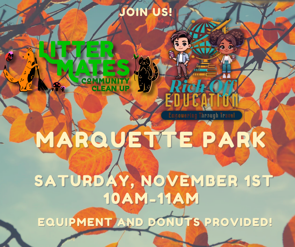 Join the Litter Mates and Rich Off Education as they complete their monthly litter cleanup at Marquette Park! All volunteers are welcome to join for an hour of cleaning up and beautifying the park. All needed supplies and light refreshments will be provided. Please wear closed-toe shoes and weather-appropriate clothing.