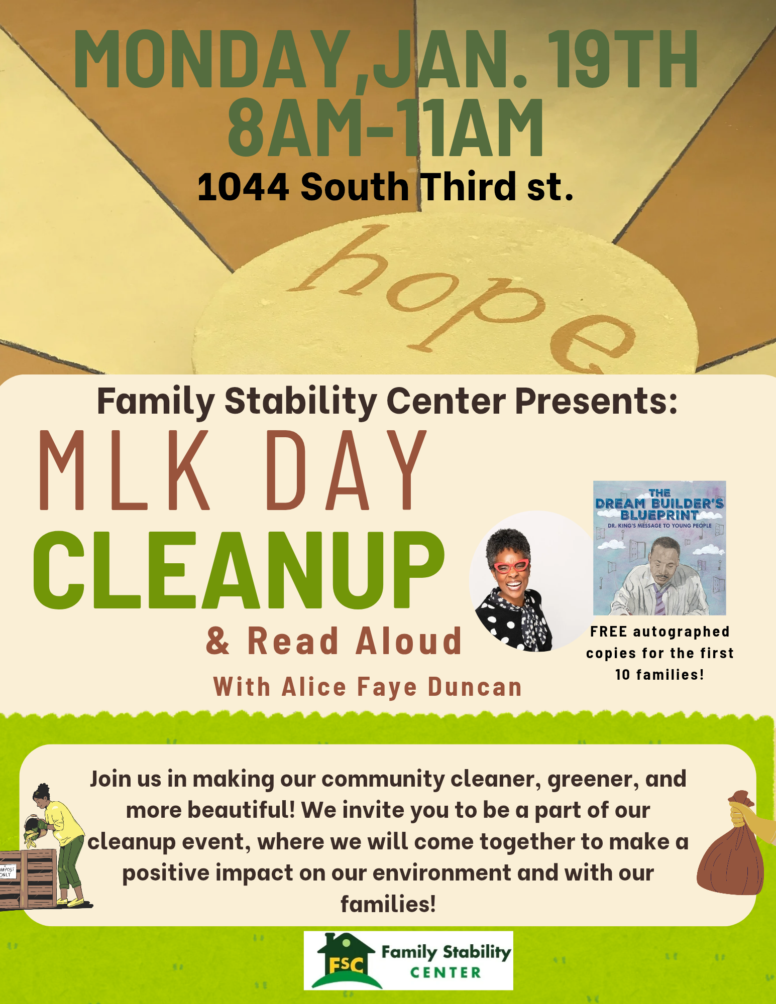 Join the Family Stability Center in making the community cleaner, greener, and more beautiful! All are invited to be part of the cleanup event, to come together to make a positive impact on the environment. Needed volunteer supplies will be provided. Please dress in weather-appropriate clothing and wear closed-toe shoes.