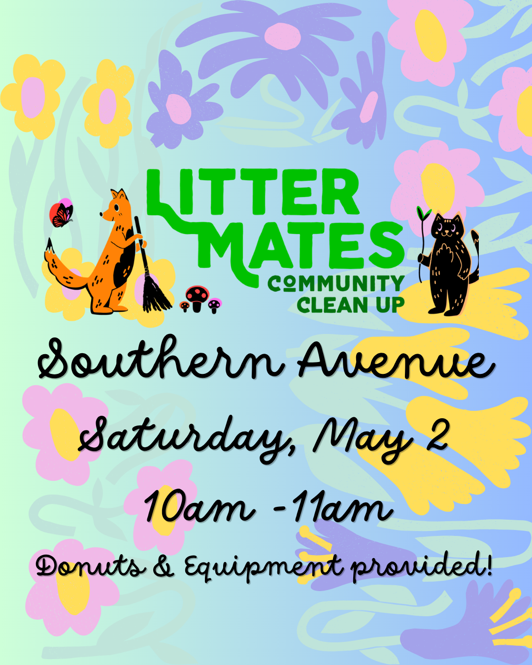 Join the Litter Mates as they complete their monthly litter cleanup on Southern Ave! All volunteers are welcome to join for an hour of cleaning up and beautifying the street. All needed supplies and light refreshments will be provided. Please wear closed-toe shoes and weather-appropriate clothing.